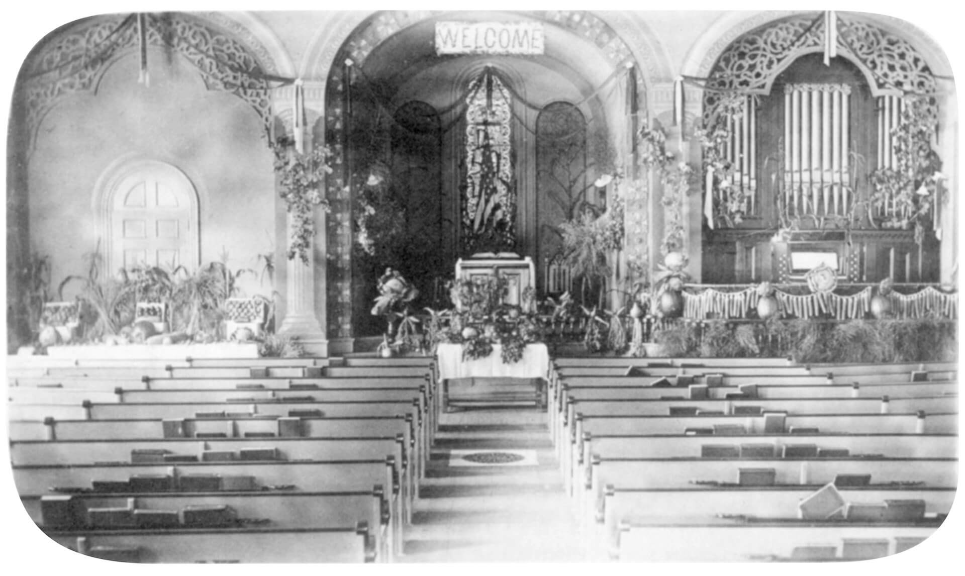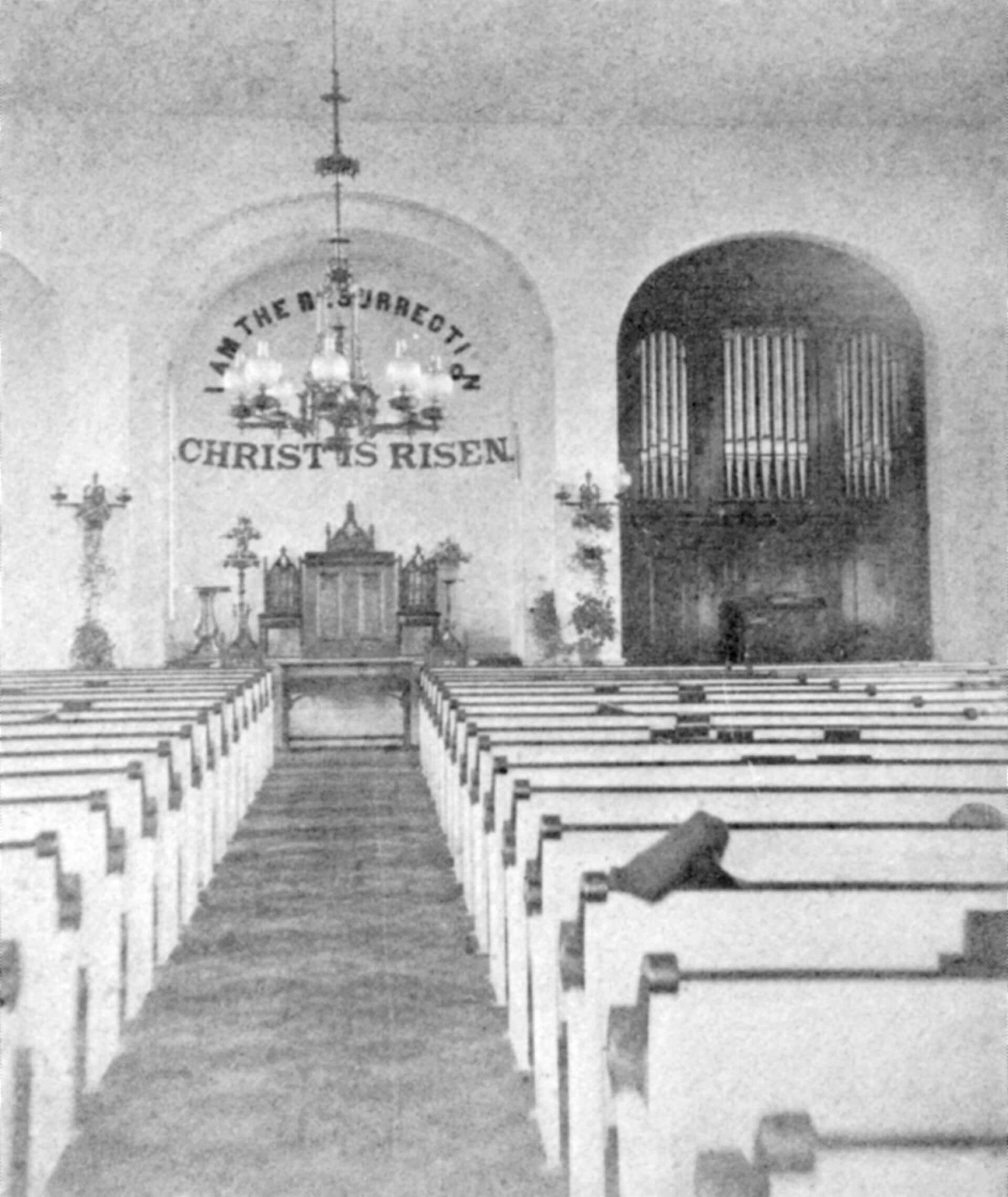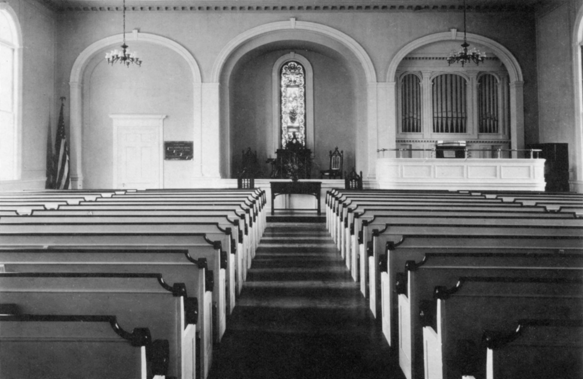 The Sanctuary in 1931 with stained glass window and singing seats.