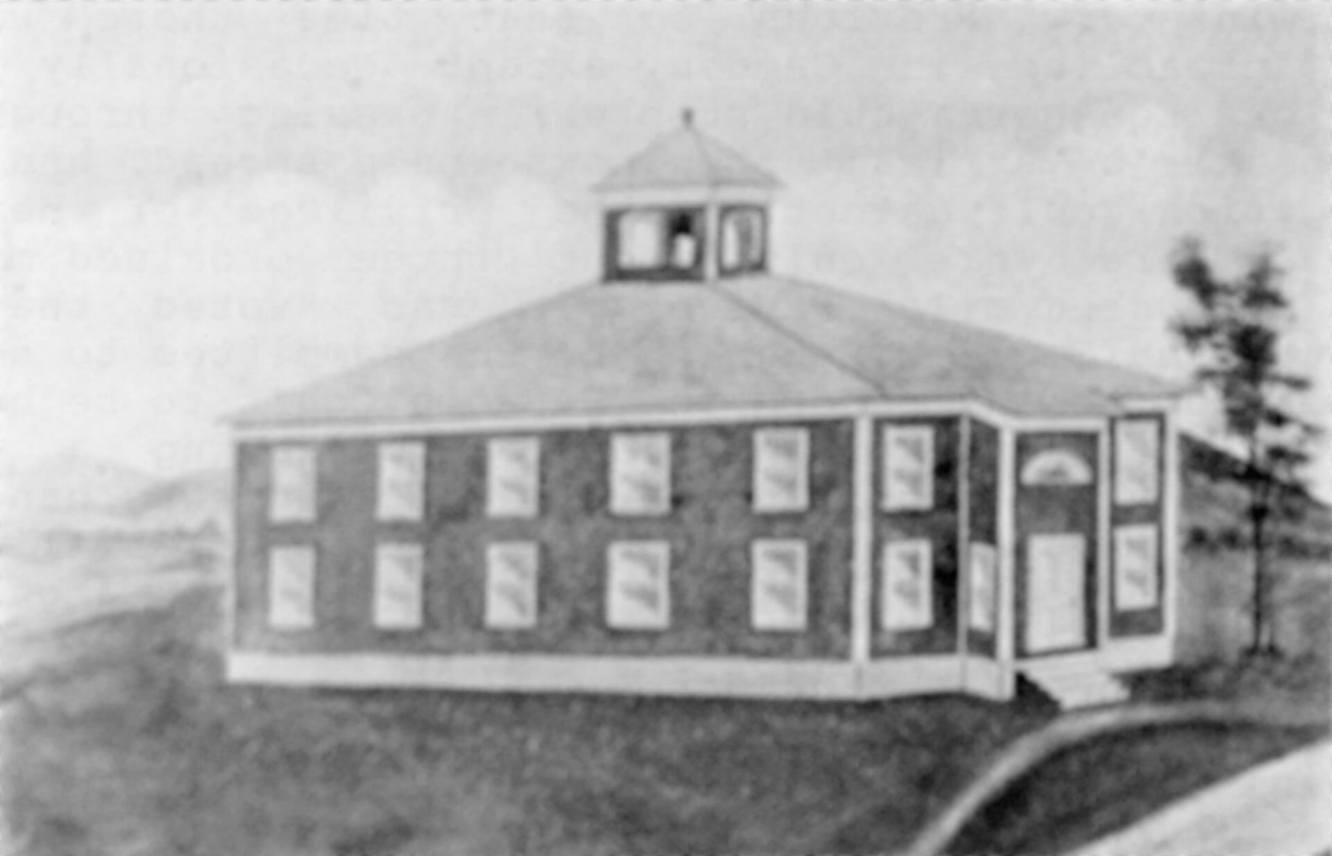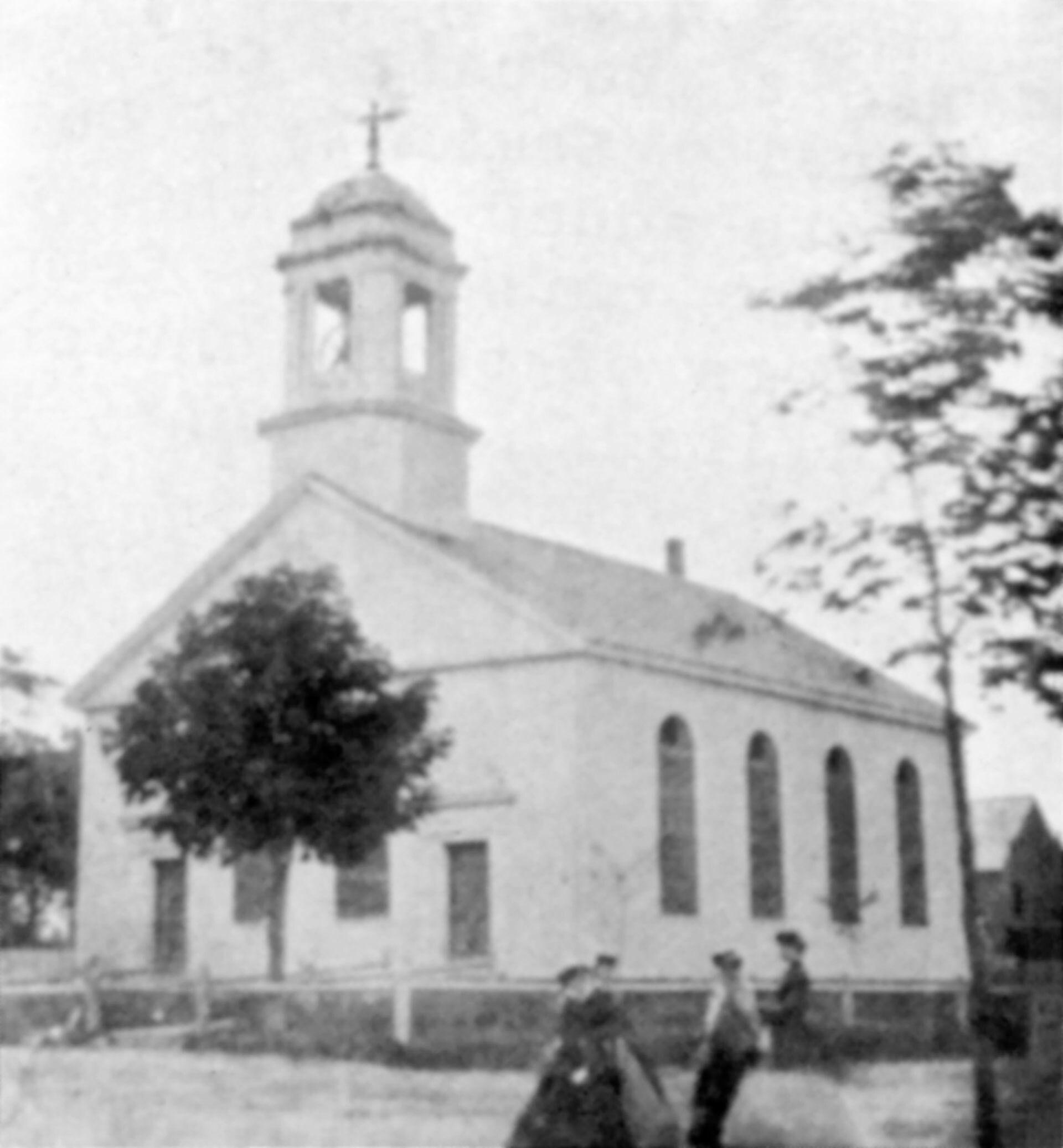 The first meeting house. Erected 1799 at the corner of Elm and Park Streets.