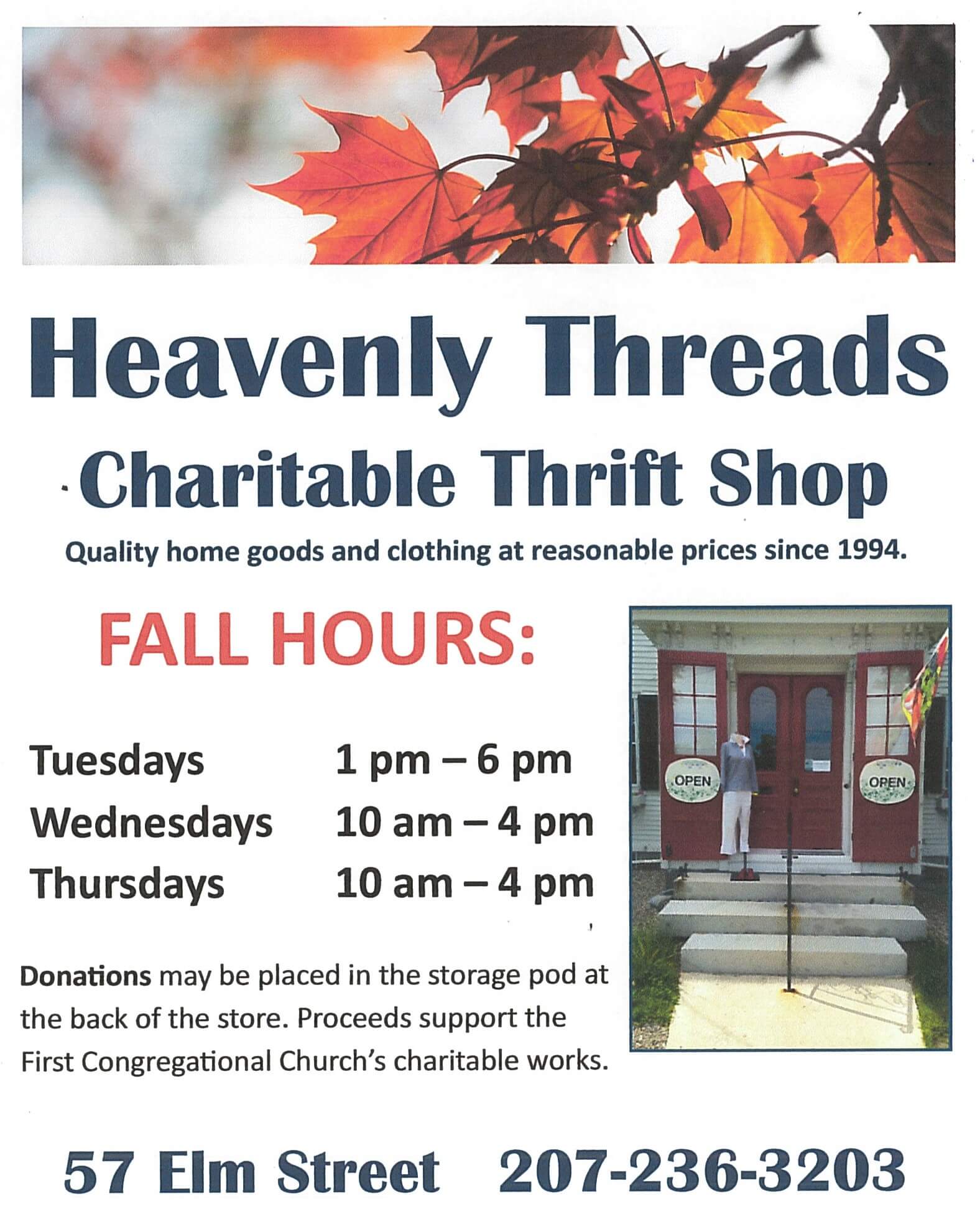 The Heavenly Threads Thrift Shop has been a mission of the First Congregational Church of Camden since 1994. Located at 57 Elm Street in the former church manse, the shop offers gently used clothing, fashion items, jewelry, artworks, books, and home goods at reasonable prices. Proceeds from sales support the church’s essential works of service in the community, helping individuals and non-profit organizations throughout Knox County and Lincolnville.